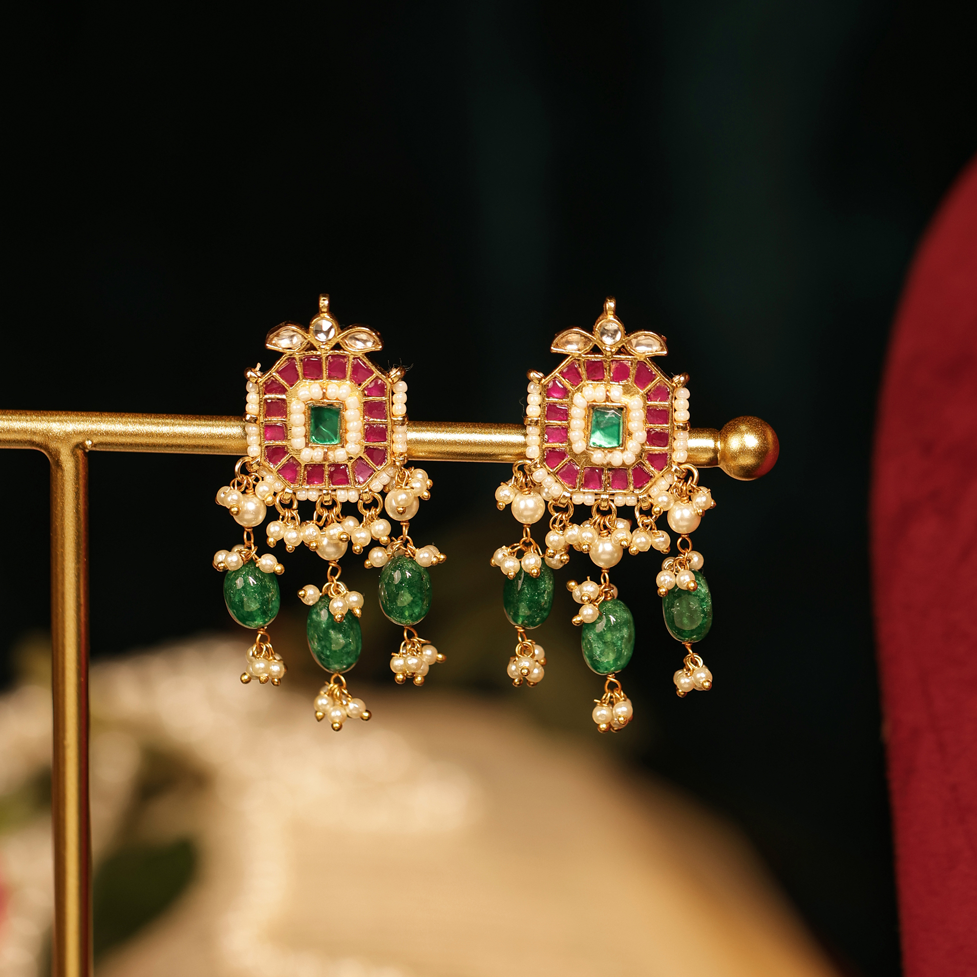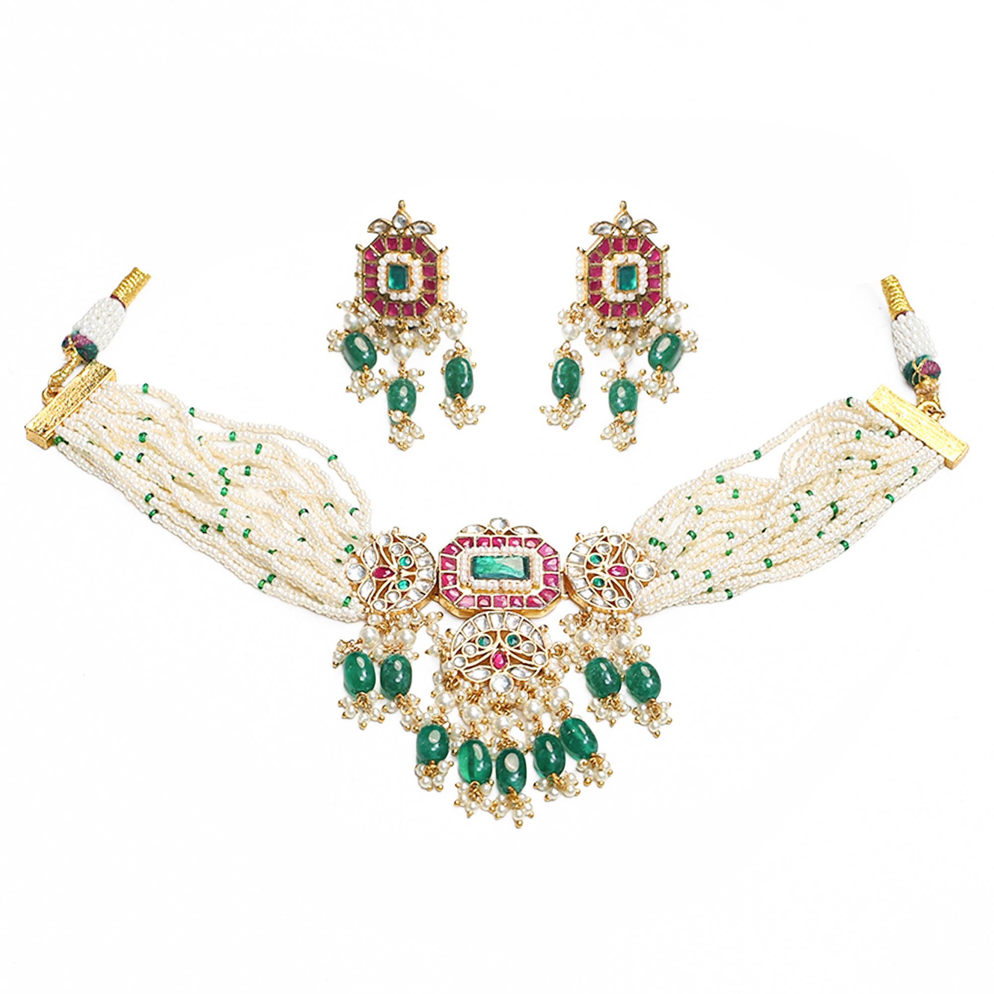 Tulsi Jewells presents this handcrafted Ruby-Green Jadau Kundan Choker Necklace Set, featuring a stunning rectangular Kundan centrepiece bordered with rich ruby stones. The necklace is further enhanced with intricate side motifs, pearl detailing, and vibrant green bead drops that create a bold and elegant look.