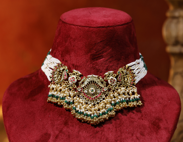 Tulsi Gems & Jewels Kundan Choker with semi-precious stones, set in Copper in Kundan stones with silver foil in 18k gold plating with semi-precious stones and natural gemstones.