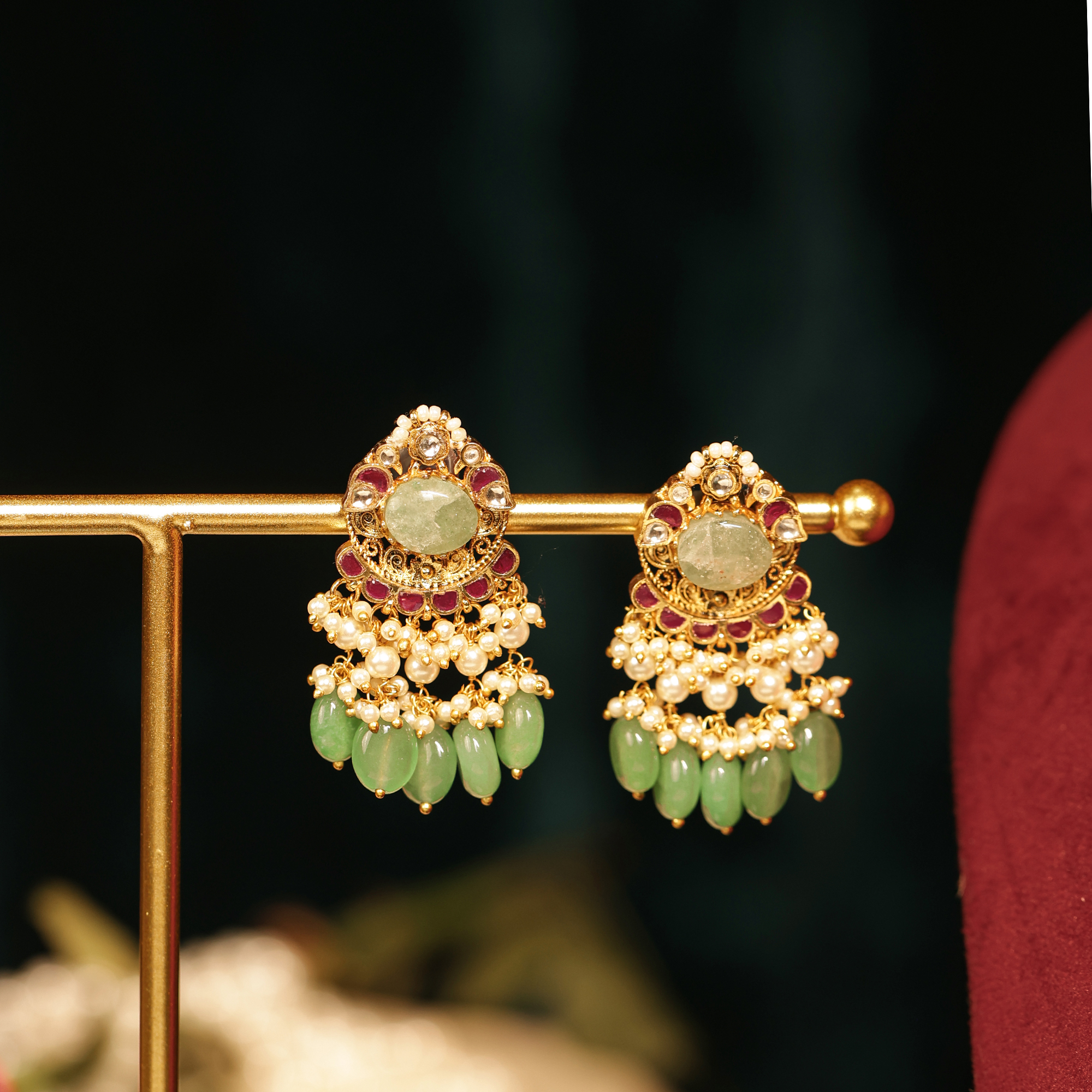 Tulsi Jewells Jadau Kundan Choker Set crafted with semi-precious stones, set in copper with silver-foil kundan detailing and gold plating. The green semi-precious droplets add a rich, regal look. High-quality Jadau Kundan is used, offering a shine similar to Polki diamonds.