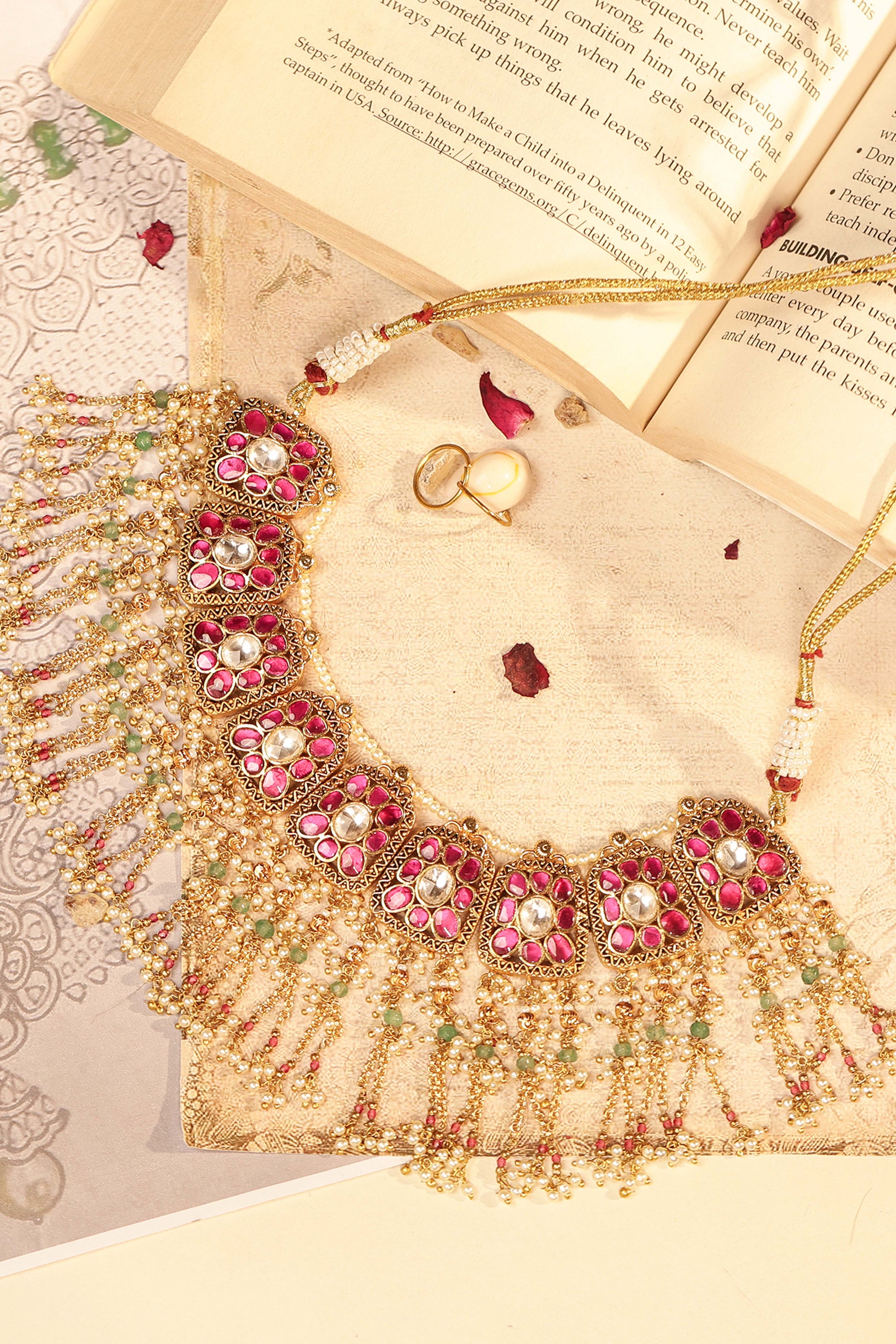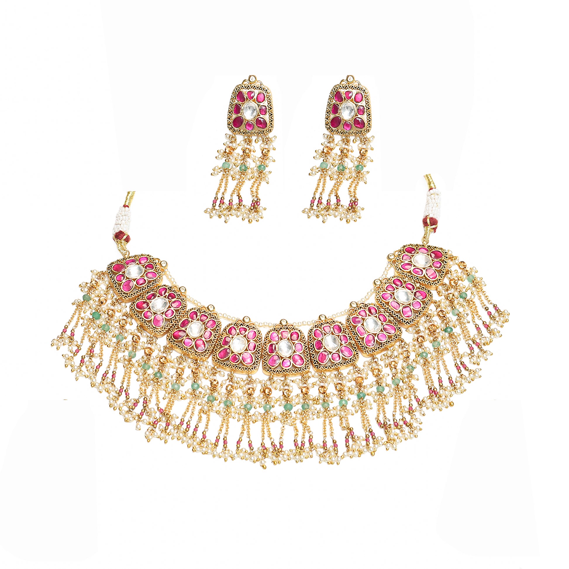 This beautiful Pink Kundan Pearl Choker Set features sparkling pink stones, delicate pearl fringes, and a soft gold-plated finish for a rich festive appeal. The elegant dangler earrings add effortless charm, completing the look with refined grace.