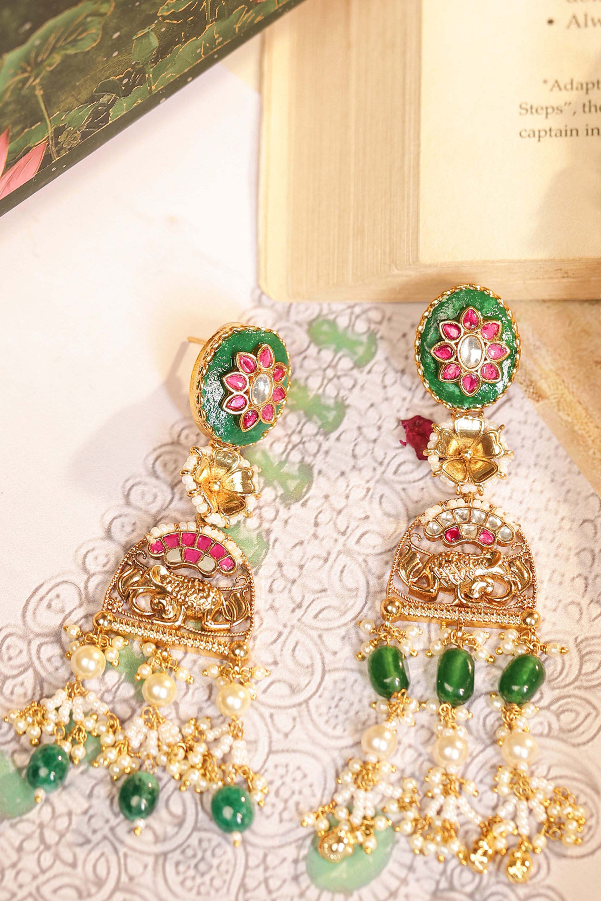 This festive Multicolor Designer Kundan Choker is beautifully handcrafted with sparkling kundan stones, vibrant multicolor detailing, and elegant pearl strands. The refined gold-plated finish adds a graceful traditional touch, while the statement drop earrings complete the look with rich festive charm.