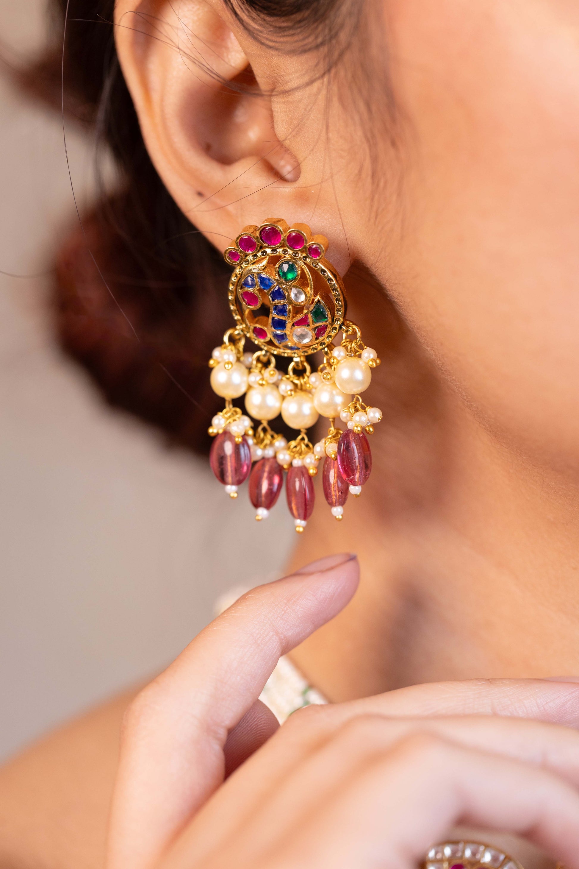 This charming Peacock Kundan Choker Set is crafted with kundan stones, soft pearls, and pink bead accents. The warm gold finish and peacock-inspired detailing lend a graceful and elegant appeal, while the matching earrings complete the look with subtle sophistication.