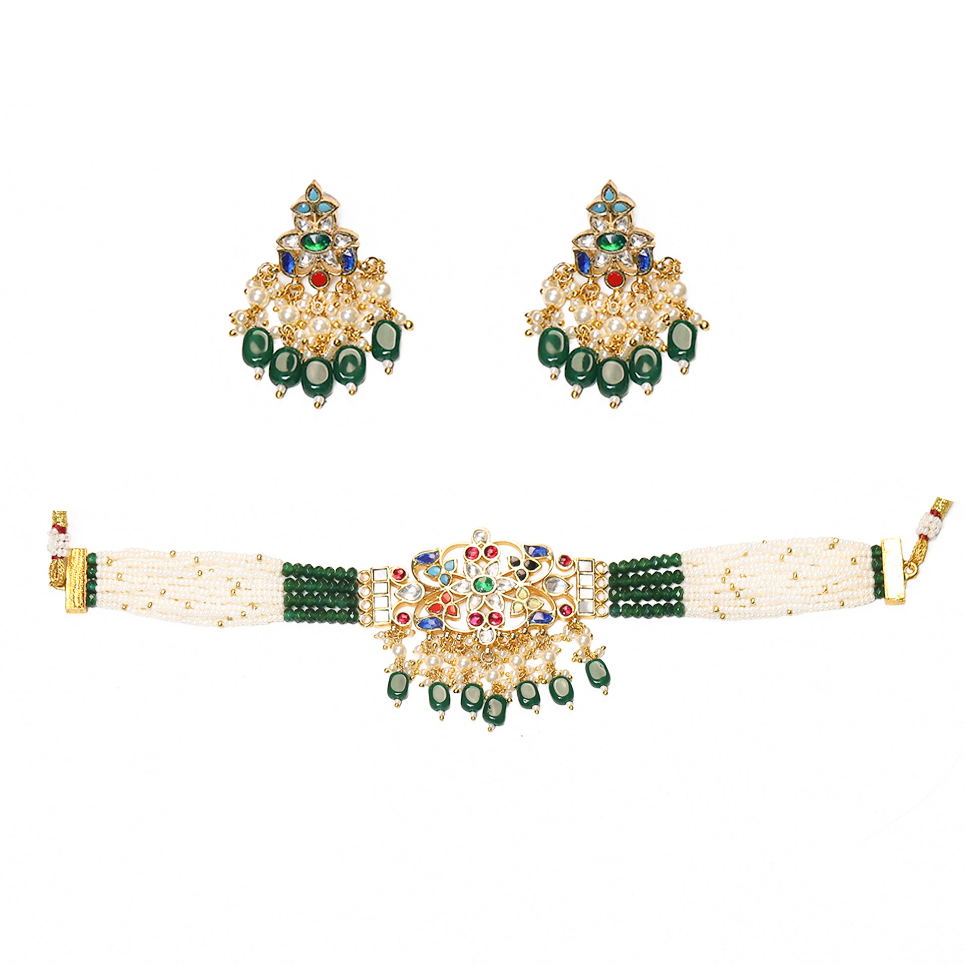 Green Bead Kundan Choker Necklace Set, Pearl Gemstone Earrings Jewelry