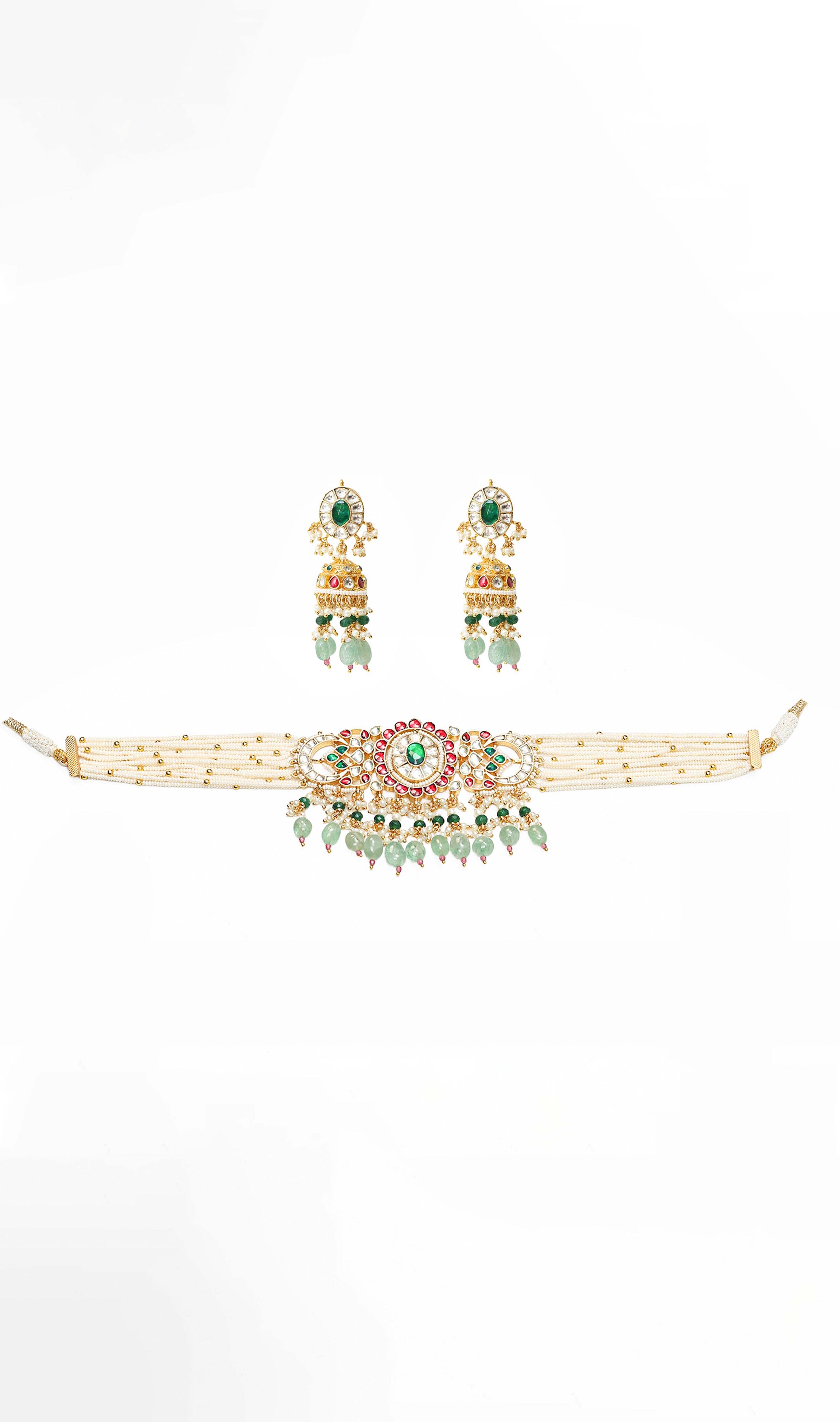 This elegant Multicolor Kundan Choker Set is beautifully handcrafted with sparkling kundan stones, soft pearl accents, and delicate green bead drops for a refined traditional appeal. The smooth gold-plated finish enhances its graceful charm, while the matching drop earrings complete the look perfectly.